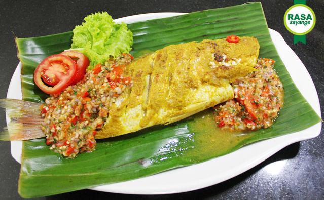 8. Angkat ikan, letakan diatas piring saji buka daunnya. Siram dengan bahan 4.