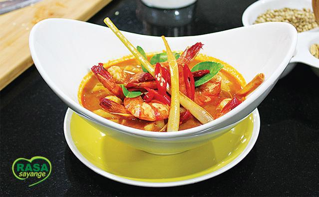 - Masukkan udang, masak selama 5 menit hingga udang berwarna merah.
