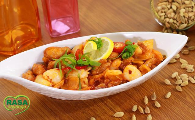 5. Masukkan ayam tambahkan garam, gula, cuka apel, irisan cabe, cabe bubuk, daun bawang, dan LADAKU. Aduk terus hingga mengental. Sajikan