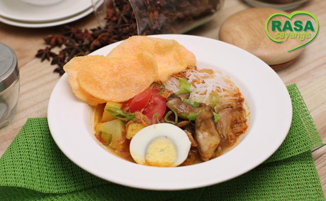 4. Letakkan kentang dalam mangkok. Di atasnya letakkan soun, tomat, ayam, kuah ayam, telur, bawang goreng, daun bawang dan krupuk merah.