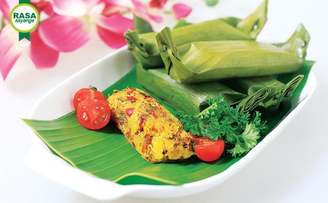 5. Ambil daun lalu isi dengan adonan kemudian bungkus menyerupai pepes.