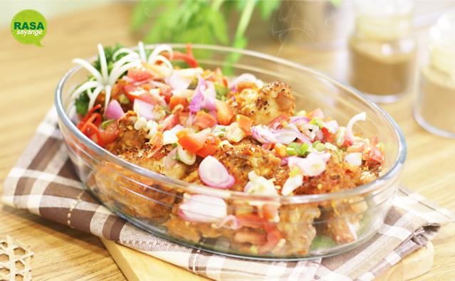 5. Letakkan di atas piring kemudian siram dengan campuran bahan 4 di atasnya.
