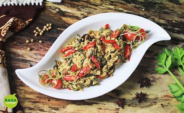 4 lembar daun talas di rajang, remas dengan garam, cuci bersih rebus dengan jus nanas (50g nanas 300 ml air) hingga air habis, tiriskan