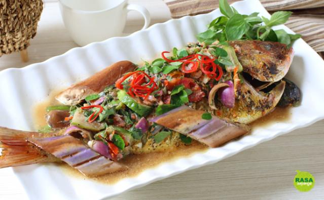 Panaskan pan atau bara arang, beri sedikit minyak lalu bakar ikan hingga matang selama 15-20 menit dengan api sedang kemudian letakkan di piring hidang. Sisihkan.